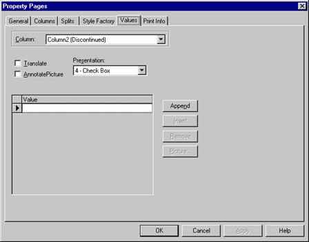 You can also use the ValueItems collection to represent Boolean values as in-cell check boxes. Prior to version 6.0, you had to define two ValueItem objects (representing the underlying values 0 and -1) and assign an appropriate DisplayValue picture to each one. However, in version 6.0 and newer, you can achieve the same effect without defining any ValueItem objects—just set the Presentation property to 4 - Check Box.