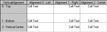 The following list depicts all possible combinations of the Alignment and VerticalAlignment properties (the general setting is omitted because it is ultimately rendered as left, right, or center).
