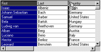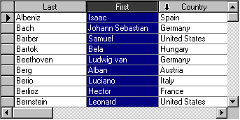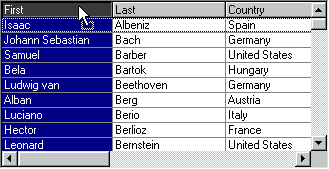 If the AllowColMove property is True, the user can move previously selected columns as a unit to a different location by pressing the mouse button within the header area of any selected column. The pointer will change to an arrow with a small box at its lower right corner, and the divider at the left edge of the column being pointed to will be enlarged and highlighted.