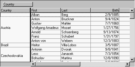 It is important to note that the act of moving columns to or from the grouping area does not sort the underlying data source; it simply provides a convenient way to manipulate a split containing nonscrolling columns. Therefore, if you want a grouped column to appear in sorted order, you must sort it explicitly in code. Typically, this is done in the GroupColMove event, which is fired before a column is moved to or from the grouping area. You can also use the GroupHeadClick event, which is fired when a column header is clicked within the grouping area.
