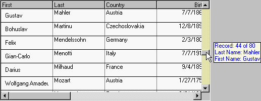 In some instances, you may want the list control scroll bars to be a bit more interactive, allowing the user to see changes and helpful information as they navigate through the control data. By using the ScrollTrack property, the list control contents is updated as the scrollbar thumb is moved. With the ScrollTips property, an informational pop-up is provided, containing whatever content you choose.