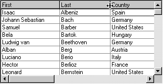 If the AllowSizing property is True for a column, the user can adjust the width of the column individually at run time. When the user points to the divider at the right edge of a column's header, the pointer changes to a horizontal double arrow, which the user can drag to resize the column in question.