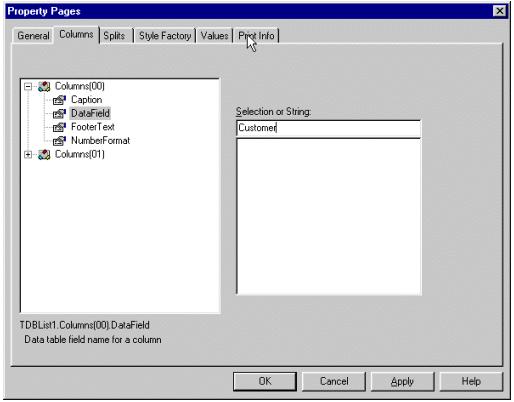 To associate a database field with a list column, choose Properties from the visual editing menu (or context menu) to display the Property Pages dialog box, and then click the Columns tab to display the Columns property page. Expand a numbered column node in the property tree on the left, and then select the DataField property.