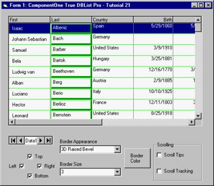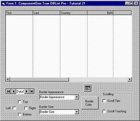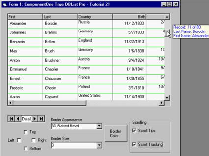 In this tutorial you will utilize the Cell Border, Scroll Tips and Scroll Tracking features in True DBList. The Cell Border feature allows you to manipulate border options at runtime, while the Scroll Tips and Scroll Tracking features allow you to track the location of your scroll bar and give the user an informational pop-up as the scroll bar moves.