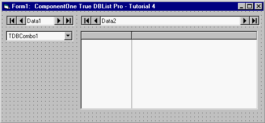 Place two Data controls (Data1 and Data2), a True DBCombo control (TDBCombo1), and a True DBList control (TDBList1) on the form (Form1) as shown in this figure.