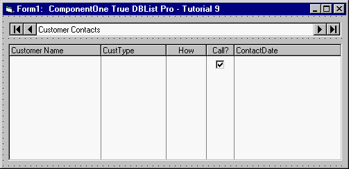 After defining the bitmap entries for Column2 (ContactType), open the Column combo box again and select Column3 (Callback). This column contains a Boolean field with allowable values of 0 and -1 (False and True), which in this case represent whether a call needs to be returned. We shall display check boxes instead of Boolean values.