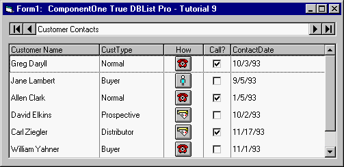 The possible values of the ContactType field are 0, 1, and 2, which represent telephone, mail, and personal contact, respectively. We shall display bitmaps in the cell instead of these numeric values. If you installed the full product, you will find the following files in the BITMAPS subdirectory of the True DBList installation directory: PHONE.BMP, MAIL.BMP, and PERSON.BMP.