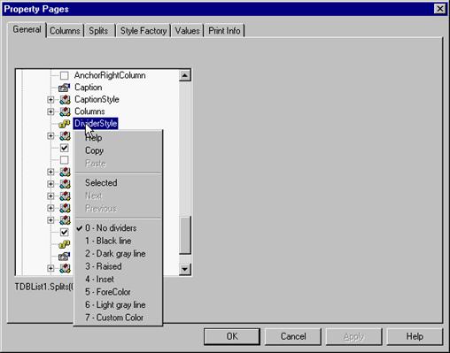This command applies the value of the selected property to all sibling objects within the collection. The input controls to the right of the property tree determine which value is used, even if the value has not yet been committed to the list itself. For example, if the WrapText property is selected for the fourth column of the second split, and the True option button is selected, then this command is displayed in the context menu as Set All Columns, and executing it sets the WrapText property of all columns in the second split to True.
