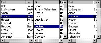 By default, the list has only one split, with split index 0, and its ScrollBars property is set to 4 - Automatic. That is, the horizontal or vertical scroll bar will appear as necessary depending upon the column widths and the number of data rows available. The default split's ScrollGroup property is 1. Splits having the same ScrollGroup property setting will scroll vertically together. When a new split is created, it will inherit both the ScrollBars and ScrollGroup properties from the parent split. If all of the splits belonging to the same ScrollGroup have their ScrollBars properties set to 4 - Automatic, then True DBList will display the vertical scroll bar only at the rightmost split of the scroll group. Manipulating this scroll bar will cause all splits in the same scroll group to scroll simultaneously.