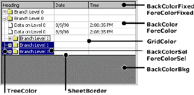 The VSFlexGrid control has several properties that allow you to customize its colors. The picture below shows these properties and to which part of the control each one refers: