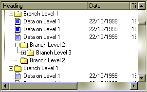 ' initialize grid fg.Rows = 1: fg.FixedRows = 1 fg.Cols = 3: fg.FixedCols = 0 fg.OutlineBar = flexOutlineBarSimpleLeaf fg.GridLines = flexGridNone fg.FormatString = "Heading |Date |Time " ' fill the control with data Dim i%, j% While fg.Rows < 150 ' decide randomly whether to add a subtotal If fg.Rows <= 2 Or Rnd() < 0.4 Then ' add an item, make it a subtotal fg.AddItem "Branch Level " & i fg.IsSubtotal(fg.Rows - 1) = True fg.RowOutlineLevel(fg.Rows - 1) = i fg.Cell(flexcpPicture, fg.Rows - 1, 0) = imgFolder j = I ' decide whether to go deeper or shallower If Rnd() < 0.5 And i < 10 Then i = i + 1 ElseIf Rnd() < 0.5 And i > 0 Then i = i - 1 End If ' add a regular item Else fg.AddItem "Data on Level " & j & vbTab & _ Date & vbTab & Time fg.Cell(flexcpPicture, fg.Rows - 1, 0) = imgItem End If Wend ' do an autosize fg.AutoSize 0, 1, , 300 |
