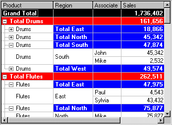 ' clear existing subtotals fg.Subtotal flexSTClear ' get an Grand total (use 1 instead of columns index) fg.Subtotal flexSTSum, -1, 3, , 1, vbWhite, True ' total per Product (column 0) fg.Subtotal flexSTSum, 0, 3, , vbRed, vbWhite, True ' total per Region (column 1) fg.Subtotal flexSTSum, 1, 3, , vbBlue, vbWhite, True ' show an OutlineBar on column 0 |