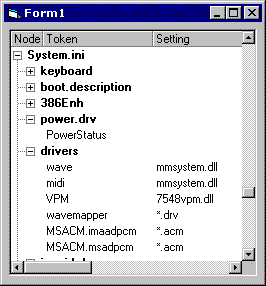 The sample reads several .INI files and presents each one as a node. Each file node has a collection of sub-nodes that contains sections within the corresponding .INI file. Each section node contains branches that show the tokens and settings stored in the corresponding section. Here is how the final project will look: