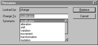 Leave the AutomaticDialog property set to its default value, vsthesEnglishDialog (1). This causes a dialog box (shown below) to show synonyms when a word is selected and the Thesaurus command button is pressed. The built-in dialog box greatly reduces the code needed to handle thesaurus checking.