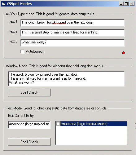 Start a new Visual Basic project, add the VSSpell control to the Visual Basic Toolbox, and add controls to create the main form. The form is divided in three sections, each consisting of a frame control with its own VSSpell control and other subordinate controls. Here is how the form should look: