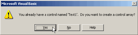 Note: Set the name for each text box in the top panel to Text1 in the properties box. When you create the second text box, a message displays asking if you want to create an array. Click Yes. The names then change to Text1(0), Text1(1). |