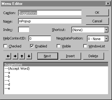 Next create the sub-items for mPopup. Click the Next button. Enter mSuggest in the Name box for each sub-item. Set the Index value according to the order of the sub-items (for example, Accept Word = 0, A=1, and so on). All sub-items within the mPopup menu should be set to visible.