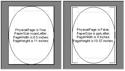 If the PhysicalPage property is set to False, the control draws and prints to the logical page. This means the page appears smaller than it actually is, and prevents output from being placed outside the printable area of the control.