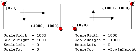 Positive values for ScaleHeight and ScaleWidth mean coordinates grow down and to the right. Negative values mean coordinates grow up and to the left.
