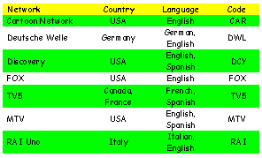 Sub ShowTable() ' create format string (widths in Twips) Dim f$ f = "+1440|+^1000|+^1000|+>700;" ' create header string (repeat across page breaks) Dim h$ h = "Network|Country|Language|Code;" ' create some dummy data ReDim b$(7) b(1) = "Cartoon Network|USA|English|CAR;" b(2) = "Deutsche Welle|Germany|German, English|DWL;" b(3) = "Discovery|USA|English, Spanish|DCY;" b(4) = "FOX|USA|English|FOX;" b(5) = "TV5|Canada, France|French, Spanish|TV5;" b(6) = "MTV|USA|English, Spanish|MTV;" b(7) = "RAI Uno|Italy|Italian, English|RAI;" ' start document vp.StartDoc ' show header and green first row vp.AddTable f, h, b(1), vbYellow, vbGreen ' append row pairs (white, green) Dim i% For i = 2 To 6 Step 2 vp.AddTable f, h, b(i), vbYellow, , True vp.AddTable f, h, b(i + 1), vbYellow, vbGreen, True Next ' done vp.EndDoc End Sub |