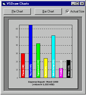 This concludes the VSDraw Chart tutorial. You may want to customize the DrawPieChart and DrawBarChart routines or to use them as a starting point to create other chart types (lines, multiple series, and so on) or a VB UserControl-based chart control.