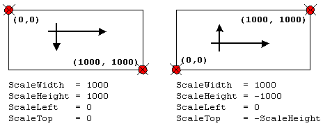 ScaleHeight defines the vertical extent of the drawing. If it is positive, coordinates grow from top to bottom. If it is negative, coordinates grow from bottom to top. ScaleTop defines the coordinate of the top edge of the control.