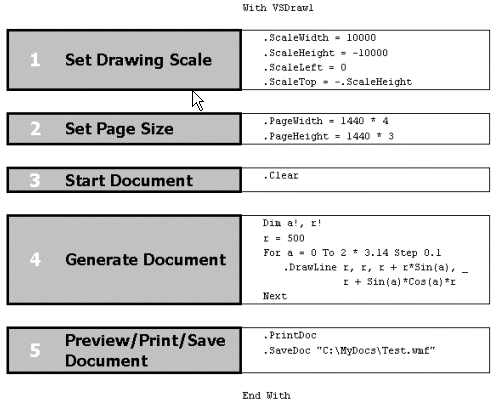 As the diagram shows, there are five main steps to using the VSDraw control.