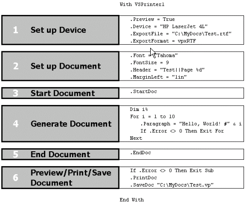 As the diagram shows, there are six main steps to using the VSPrintercontrol.