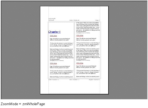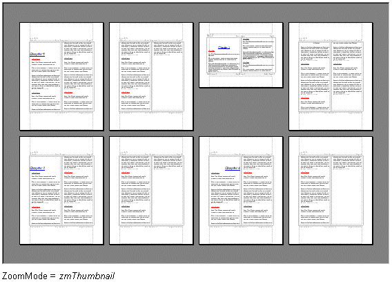 Note: In thumbnail mode (setting zmThumbnail), the control will fit as many preview pages into the control as possible. The programmer has no control over the number of thumbnails displayed, but the value is available for reading through the PreviewPages property. |