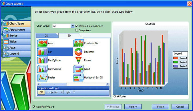 The chart control features an easy-to-use wizard. The chart wizard automatically runs when you first add a chart control to a report. If you prefer not to have the wizard run automatically, deselect the Auto Run Wizard checkbox at the bottom of the wizard.