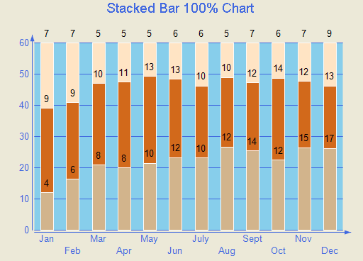 A StackedBar100Pct chart is a bar chart with two or more data series stacked one on top of the other to sum up to 100%. Use this chart to show how each value contributes to a total with the relative size of each series representing its contribution to the total.
