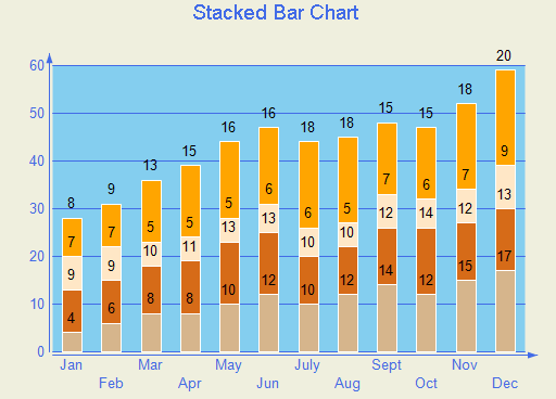 A stacked bar chart is a bar chart with two or more data series stacked one on top of the other. Use this chart to show how each value contributes to a total.