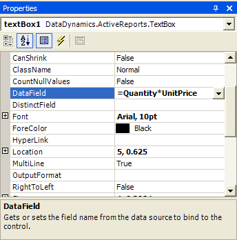 In ActiveReports, C# expressions can be used in the DataField property to specify textbox output in a report, such as date/time, mathematical calculations or conditional values. Any field expression should begin with the equals (=) sign.