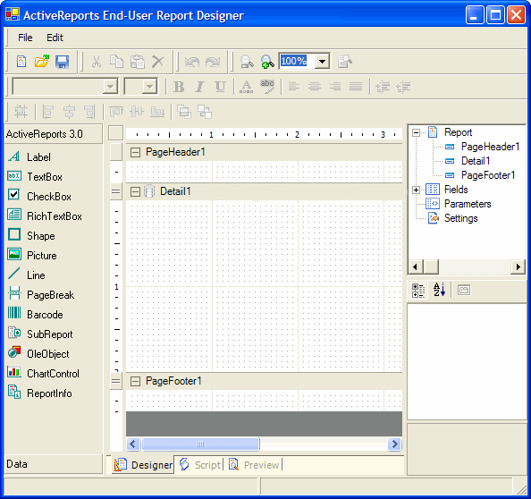 When you have finished this walkthrough, you will have a working end-user report designer that looks like the following.