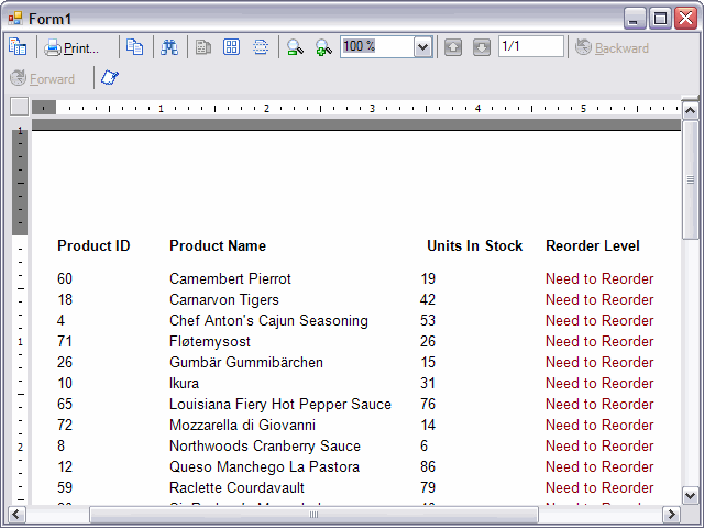 Miscellaneous Name Text Location Bold lblProductID Product ID 0, 0 Bold lblProductName Product Name 1.063, 0 Bold lblInStock Units In Stock 2.5, 0 Bold lblReorderLevel Reorder Level 3.813, 0 - Set the CanShrink property of the Detail section to True.
