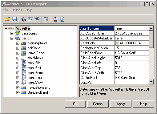 Right-click on an ActiveBar control on a form and select Properties to open the ActiveBar 3.0 Designer. The ActiveBar Designer gives you access to ActiveBar's object architecture and properties within an application.
