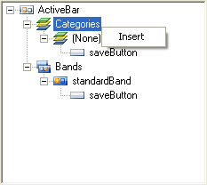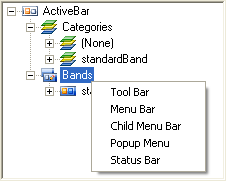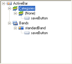 The Designer tree view has two main nodes, Categories and Bands. The tree view reflects the Band and Tool collection hierarchy of the ActiveBar 3.0 control object. The Categories node lists the tools in each category collection. The Bands node lists the bands added to your project and the Tools collection associated with each band.