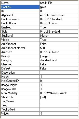 The properties list resides on the right side of the ActiveBar designer and is similar in appearance and functionality to the Visual Basic properties editor. The properties list displays the properties of the selected object in the tree view. The properties are not sorted alphabetically; the most common properties appear at the top of the list. It has the following property editors.