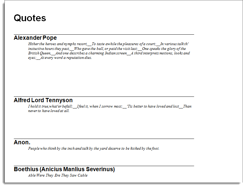 Dim titleFont As New Font("Arial", 24, RtfFontStyle.Bold) Dim txtFont As New Font("Times New Roman", 10, RtfFontStyle.Italic) ' add title Dim rcTop = WordUtils.RenderParagraph(word, word.Info.Title, titleFont, rcPage, rc) rc = rcTop ' build document For Each s As String In GetQuotes() Dim authorQuote As String() = s.Split(ControlChars.Tab) ' render header (author) Dim author = authorQuote(0) rc.Y += 25 rc = WordUtils.RenderParagraph(word, author, hdrFont, rcPage, rc, True) ' render body text (quote) Dim text As String = authorQuote(1) rc.X = rcPage.X + 36 ' << indent body text by 1/2 inch rc.Width = rcPage.Width - 40 rc = WordUtils.RenderParagraph(word, text, txtFont, rcPage, rc) rc.X = rcPage.X ' << restore indent rc.Width = rcPage.Width rc.Y += 12 ' << add 12pt spacing after each quote If rc.Y > rcPage.Height Then word.PageBreak() rc = rcTop End If Next Private Shared Function GetQuotes() As List(Of String) Dim list = New List(Of String)() Using sr = New StreamReader(DataAccess.GetStream("quotes.txt")) Dim quotes = sr.ReadToEnd() For Each quote As String In quotes.Split("*"C) Dim pos As Integer = quote.IndexOf(vbCr & vbLf) If pos > -1 Then Dim q = String.Format("{0}" & vbTab & "{1}", quote.Substring(0, pos), quote.Substring(pos + 2).Trim()) list.Add(q) End If Next End Using Return list End Function