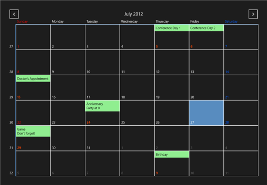Congratulations! You've completed the Calendar for WinRT quick start and created an application using the Calendar control and viewed some of the run-time capabilities of your application.