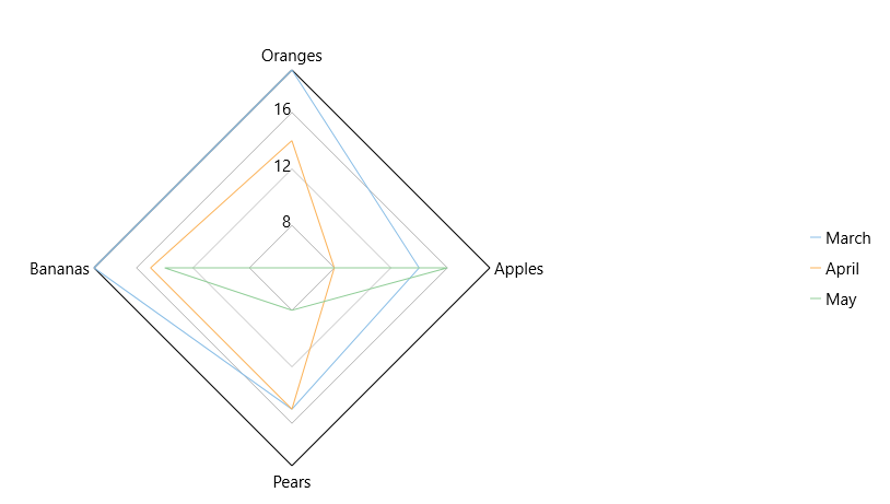 In this step, you first create a class DataCreator that generates fruit sales data for three consecutive months in a year. Next, you bind FlexRadar to the created data source using the ItemsSource property provided by the FlexChartBase class. Then, you specify fields containing X values and Y values for FlexRadar using the BindingX and the Binding property, respectively.