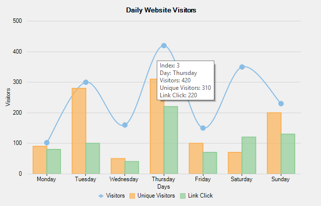 The code compares and displays data of number of daily website visitors, unique visitors, and link clicks in a specific week. The code shows how to set the ToolTipContent property to create a shared tooltip.