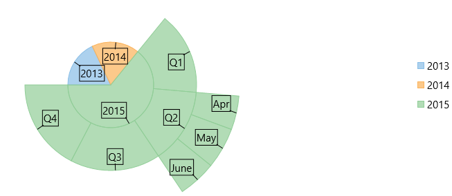 In this step, you first create a class DataService that generates random sales data for four quarters, namely Q1, Q2, Q3, and Q4 in 2013, 2014, and 2015. Next, you bind Sunburst to the created class using the ItemsSource property provided by the FlexChartBase class. Then, you specify numeric values and labels for the Sunburst slices using the Binding and the BindingName property, respectively of the FlexChartBase and the C1FlexPie class.