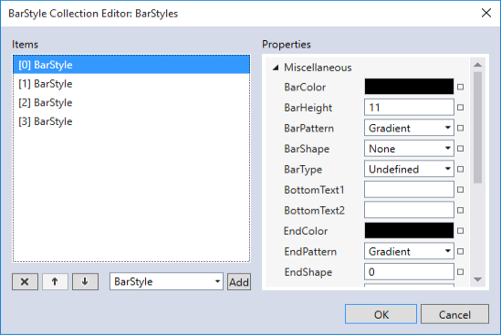 The BarStyle Collection Editor allows users to add bar styles, and modify its properties at design time. To access BarStyle Collection Editor, select the GanttView control placed on the MainWindow, navigate to the Properties window and click the ellipsis button next to the BarStyles property.