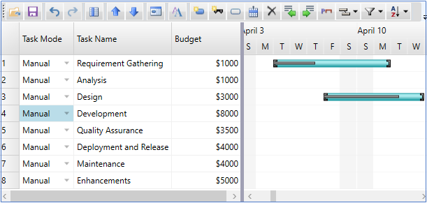 The image below shows a GanttView with a custom column titled 'Budget' that accepts numeric data and displays the same in '$' format.