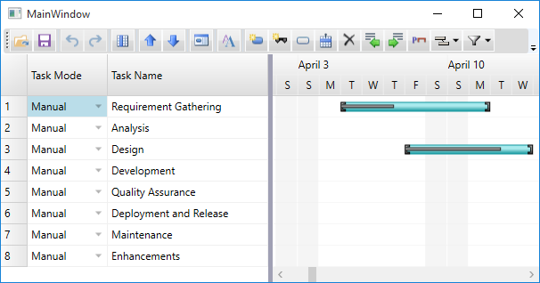 void gv_Loaded(object sender, RoutedEventArgs e) { //Configure tasks Task t = new Task(); t.Mode = TaskMode.Manual; t.Name = "Requirement Gathering"; t.Start = new DateTime(2016, 4, 5); t.Duration = 5; t.PercentComplete = 0.5; Task t1 = new Task(); t1.Mode = TaskMode.Manual; t1.Name = "Analysis"; t1.Start = new DateTime(2016, 4, 20); t1.Duration = 8; t1.PercentComplete = 0; Task t2 = new Task(); t2.Mode = TaskMode.Manual; t2.Name = "Design"; t2.Start = new DateTime(2016, 4, 8); t2.Duration = 4; t2.PercentComplete = 0.6; Task t3 = new Task(); t3.Mode = TaskMode.Manual; t3.Name = "Development"; t3.Start = new DateTime(2016, 5, 1); t3.Duration = 10; t3.PercentComplete = 0.2; Task t4 = new Task(); t4.Mode = TaskMode.Manual; t4.Name = "Quality Assurance"; t4.Start = new DateTime(2016, 4, 16); t4.Duration = 7; t4.PercentComplete = 0.2; Task t5 = new Task(); t5.Mode = TaskMode.Manual; t5.Name = "Deployment and Release"; t5.Start = new DateTime(2016, 3, 29); t5.Duration = 1; t5.PercentComplete = 0.5; Task t6 = new Task(); t6.Mode = TaskMode.Manual; t6.Name = "Maintenance"; t6.Start = new DateTime(2016, 5, 3); t6.Duration = 4; t6.PercentComplete = 1; Task t7 = new Task(); t7.Mode = TaskMode.Manual; t7.Name = "Enhancements"; t7.Start = new DateTime(2016, 5, 11); t7.Duration = 2; t7.PercentComplete = 0.8; //Add the tasks to the GanttView gv.Tasks.Add(t); gv.Tasks.Add(t1); gv.Tasks.Add(t2); gv.Tasks.Add(t3); gv.Tasks.Add(t4); gv.Tasks.Add(t5); gv.Tasks.Add(t6); gv.Tasks.Add(t7); }
