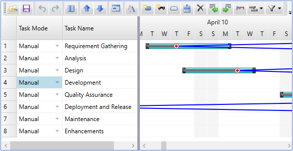Being a project planning and scheduling control, GanttView also supports progress line to indicate a task's status at any given point of time. You can create a progress line at runtime through the Progress Line button available on the toolbar. Clicking the button opens the Progress Line dialog, which can be used to select the status date, enable or disable progress line, and customize various elements of the progress line such as its color, shape, and style.