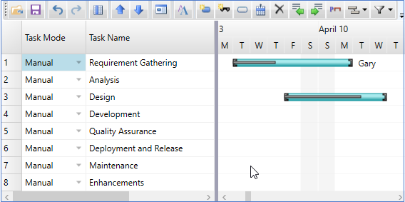 //Creating a resource Resource r = new Resource(); r.ResourceType = ResourceType.Work; r.Name = "Gary"; r.Cost = 300m; //Adding the resource to gantt view gv.TaskResources.Add(r, "Gary"); //Assigning the resource to task 't1' Task t1 = gv.Tasks.Search("Requirement Gathering"); if (t1 != null && t1.ResourceRefs.Count == 0) { ResourceRef rRef = new ResourceRef(); rRef.Resource = r; rRef.Amount = 0.5; t1.ResourceRefs.Add(rRef); }