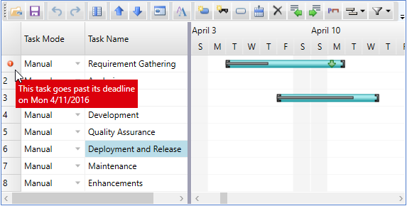 Task deadline enables users to monitor each and every activity involved within a project. GanttView also supports deadlines that allow users to keep a track of tasks exceeding their set deadline dates. Tasks exceeding their deadline dates get highlighted by a red indicator in the GanttView and shows a message box on hovering as shown in the following image.