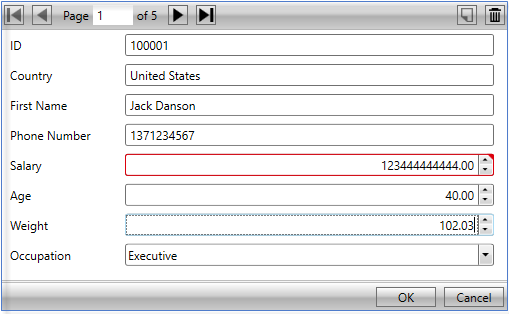 InputPanel comes with data validation support to provide users the ability to check invalid user input. The control supports built-in validation, which is performed when invalid or contradictory data is entered in an input field and is committed. For every invalid/inaccurate input, the InputPanel control displays a red frame around the input field as a visual alert.